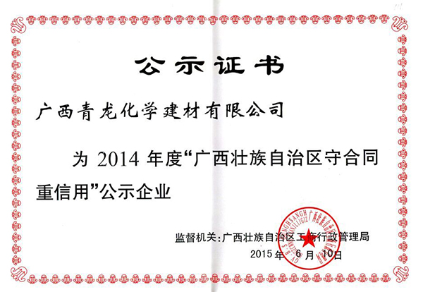 近年來,青龍公司始終秉承“一絲不句,精益求精”的企業(yè)精神和“用戶滿意,社會認同”的企業(yè)理念,在保障施工生產(chǎn)安全質(zhì)量的同時,高度重視企業(yè)信用工作。通過網(wǎng)上申報,經(jīng)市、區(qū)兩級工商局嚴格對資料審查程序和社會信譽調(diào)查及現(xiàn)場復(fù)查,公司最終從眾多申報企業(yè)中脫穎而出,榮獲2014年度廣西壯族自治區(qū)“守合同重信用企業(yè)”榮譽稱號,并在廣西紅盾網(wǎng)網(wǎng)進行通報表彰,充分展現(xiàn)了公司誠實守信的經(jīng)營理念,在廣西區(qū)建筑領(lǐng)域樹立了良好的企業(yè)信譽和社會形象, 為公司經(jīng)營投標增加了砝碼,進一步增強了公司的市場競爭力。